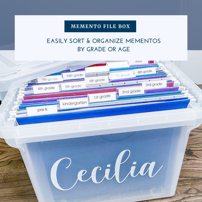 Directions to Make It: Label each folder by grade from Pre-K through college and label the outside of the box with your child’s name (we think vinyl labels look best for this!) We also include three additional folders labeled baby, cards and awards.